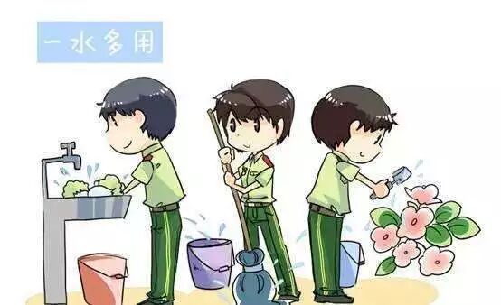 随时关上水龙头,别让水白流;看见漏水的龙头一定要拧紧它。尽量使用二次水。例如,淘米或洗菜的水可以浇花、洗脸;洗衣后的水可以留下来擦地、冲厕所。