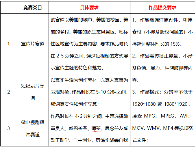 4.参赛形式:根据主题提交视频版参赛作品,由大赛组委会进行统一评阅打分。大赛涉及到宣传片赛道、短记录片赛道、微电视剧短片赛道,参赛者可根据自身情况选择其中任一赛道进行参赛,三个组别分开评奖。