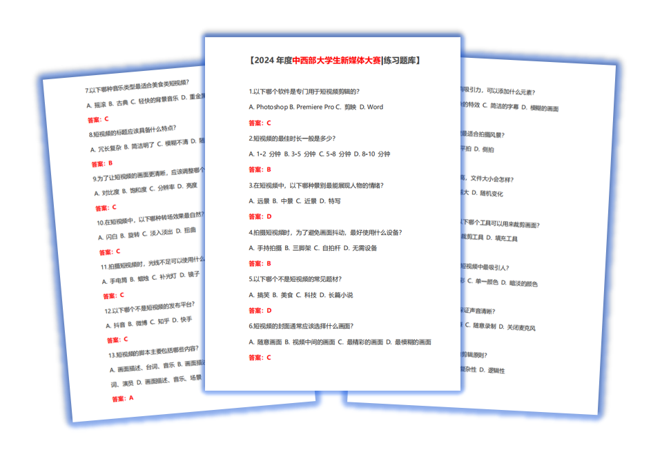 3.题目类型:客观题(50道单项选择题),练习题库与正式题库同步上线,练习题库供同学们参考练习,占比正式考试题目的50%,考查参赛者短视频基础知识储备,由系统自动评卷打分。