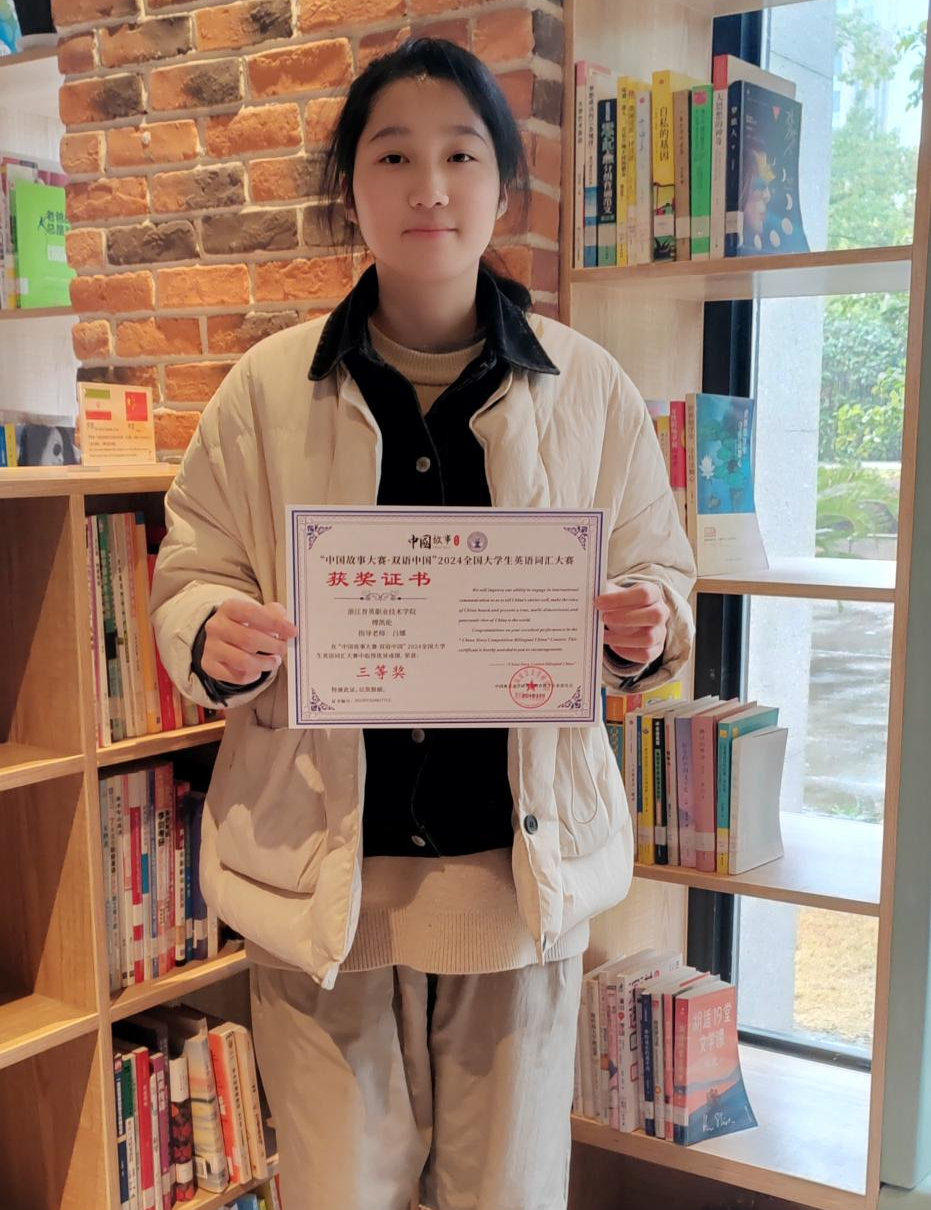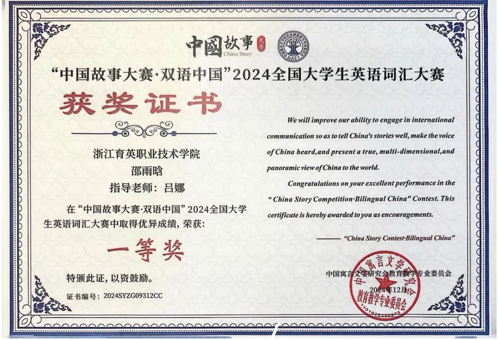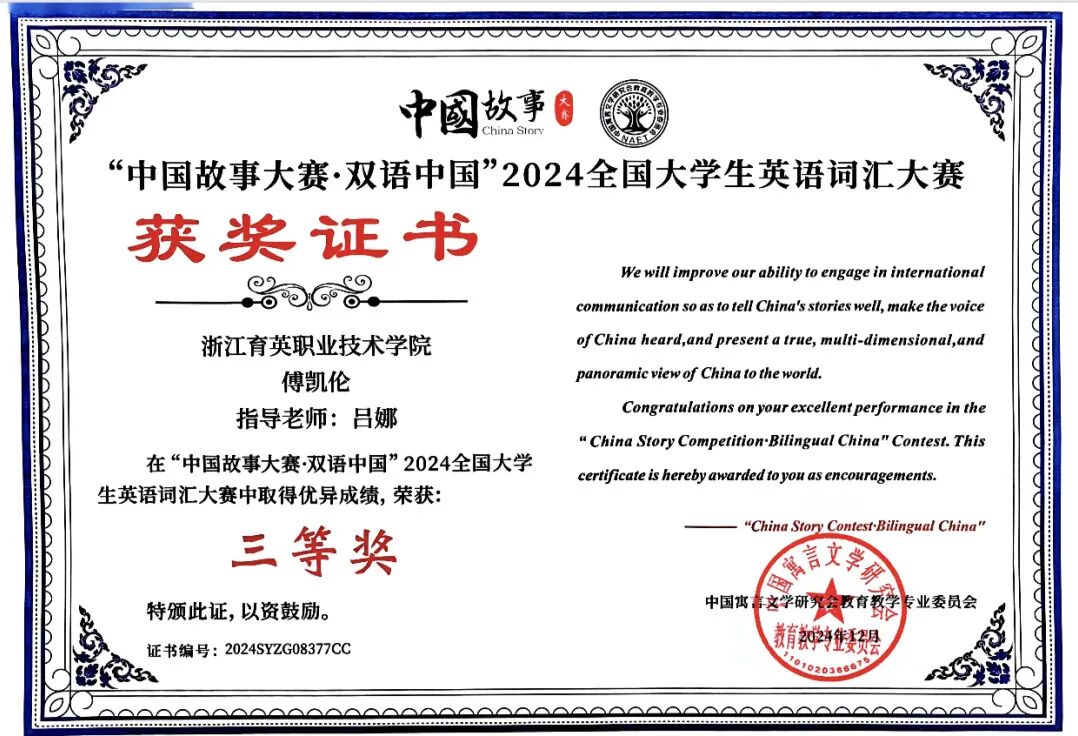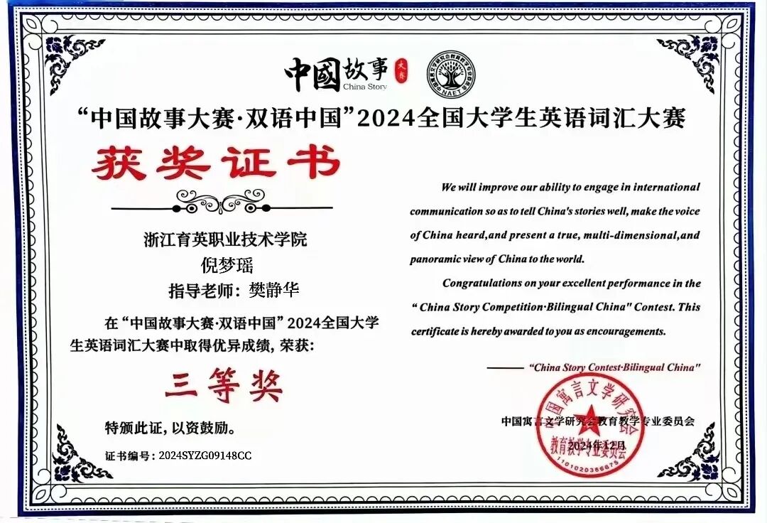 2025年1月,中国寓言文学研究会公布了“中国故事大赛·双语中国”2024全国大学生英语词汇大赛获奖名单, 23轨道C班邵雨晗同学斩获B组全国一等奖的好成绩。23空五B班倪梦瑶、24轨道A班傅凯伦和24空五C班周佳璇同学纷纷获得B组全国三等奖。“中国故事大赛·双语中国”2024全国大学生英语词汇大赛以“讲好中国故事,让世界读懂中国。”为主题,比赛内容围绕赓续和传承中国优秀传统文化,传播中国历史文化,宣传中国精神,中外文化互鉴交流等题材展开,吸引了众多高校优秀学子参与。民航交通学院的同学们首次参赛,就取得了优异的成绩,她们的出色表现赢得评委的好评。
