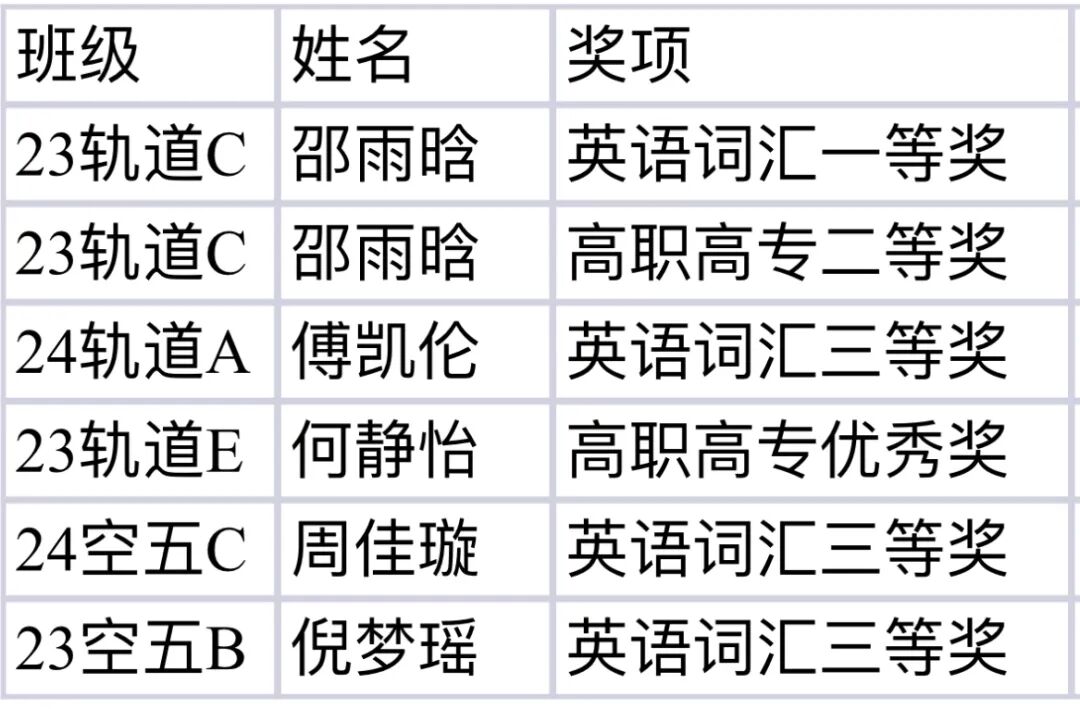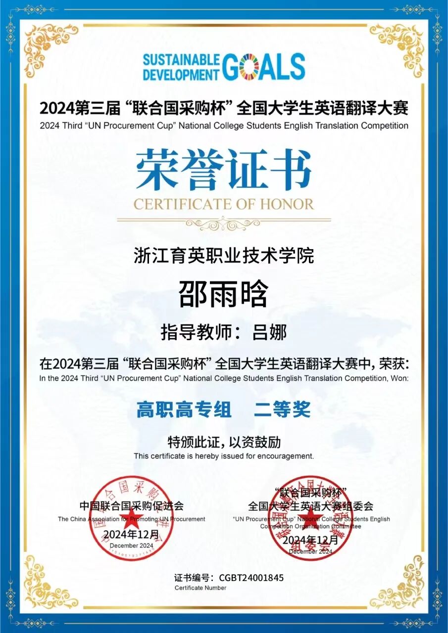 此外,2024年12月,中国联合国采购促进会公布了2024年第三届“联合国采购杯”全国大学生英语翻译大赛获奖名单。邵雨晗再次获得高职高专组二等奖,23轨道E班何静怡荣获高职高专组优秀奖。恭喜她们!