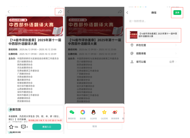 成功报名志愿者活动后,直接转发本大赛(//m.icdtc3.com/vse/cwctic/2025)赛事页面+一句话文案至朋友圈和QQ空间,满3小时,不能设置分组或仅个人可见。