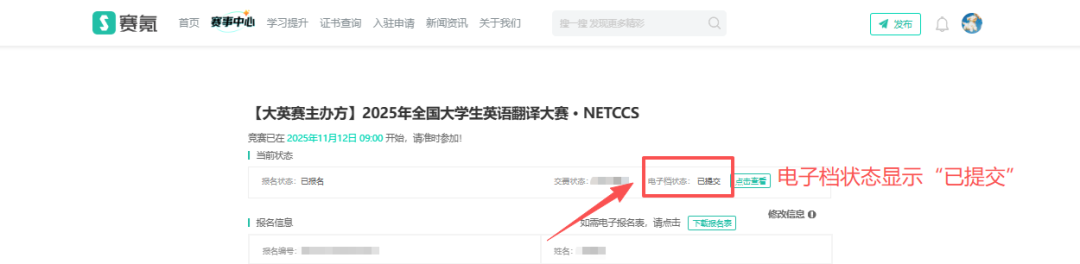 3、返回报名管理处查看电子档状态,应显示为“已提交”