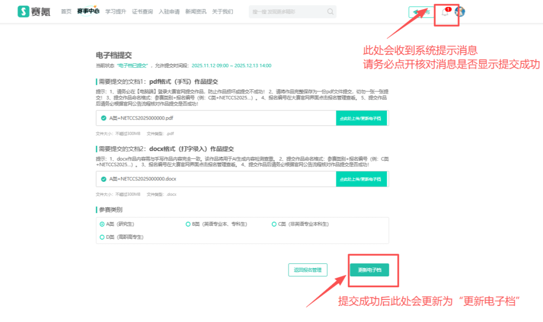 1、作品提交成功后会显示为“更新电子档”—并收到系统的提示消息