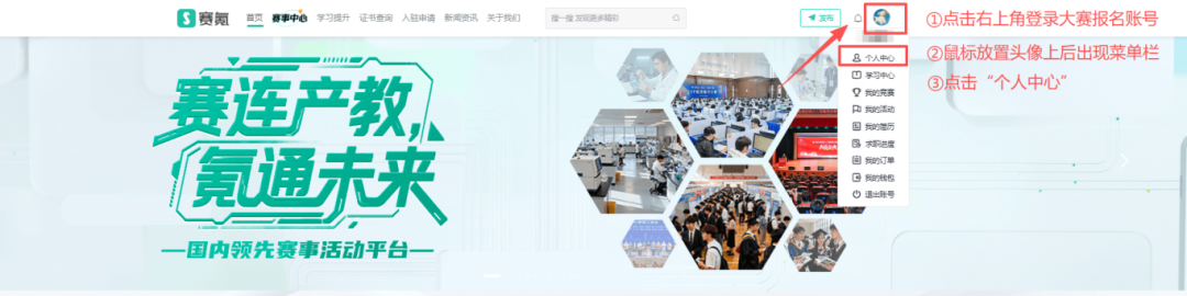 1、在电脑端浏览器搜索“伟德victory”—进入伟德victory官网—在伟德victory页面点击右上角“登录/注册”登录大赛报名账号—登录后鼠标放置头像处触发菜单栏—点击“个人中心”