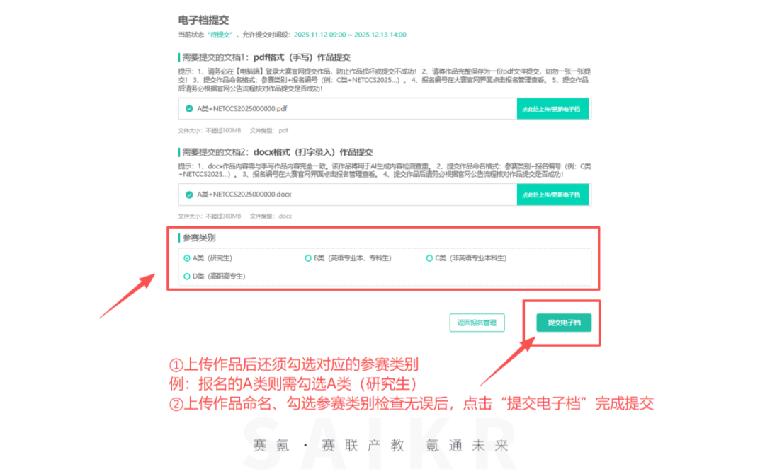 2、上传作品后须勾选对应的参赛类别—检查上传作品命名、勾选参赛类别无误后点击“提交电子档”