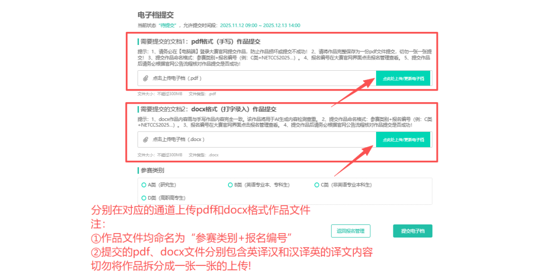 注:pdf和docx作品文件均须命名为“参赛编号+报名编号”,报名编号可前往大赛官网-报名管理处-个人信息处查看)