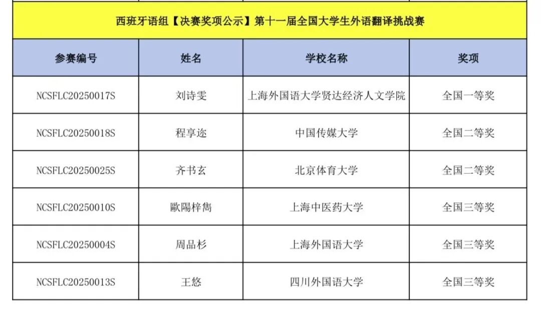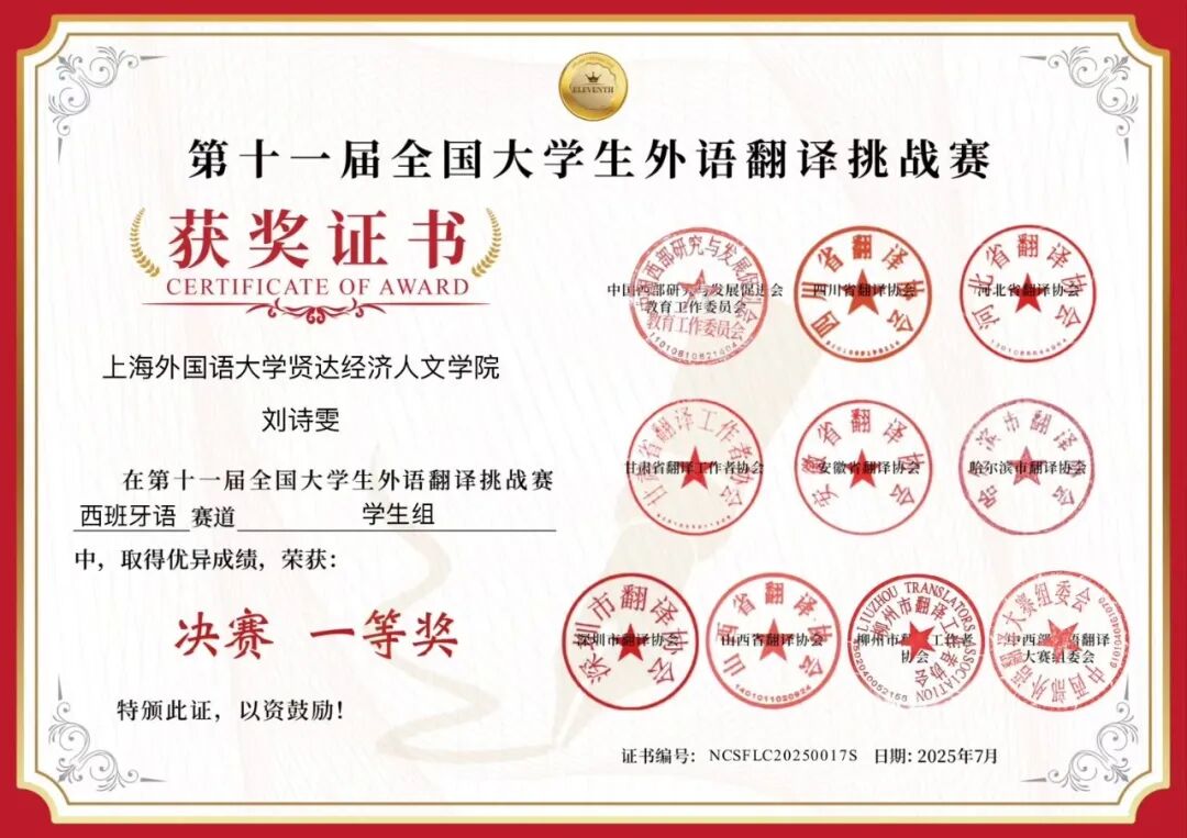 近日,第十一届全国大学生外语翻译挑战赛圆满落幕,经过激烈角逐,我院西班牙语(商务方向)专业2022级学生刘诗雯在耿超老师的指导下,凭借扎实的语言功底、出色的翻译能力和稳定的临场发挥,在众多选手中脱颖而出,荣获全国一等奖!