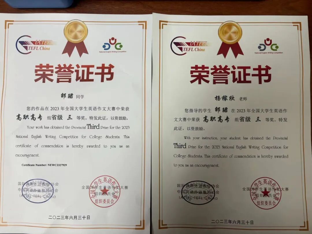 在2023年5月由国际英语外语教师协会、中国英语外语教师协会主办的全国大学生英语作文大赛中,我院教务处基础部英语教师杨稼欣指导222级康复班学生谭语希和邵珺积极参加比赛。