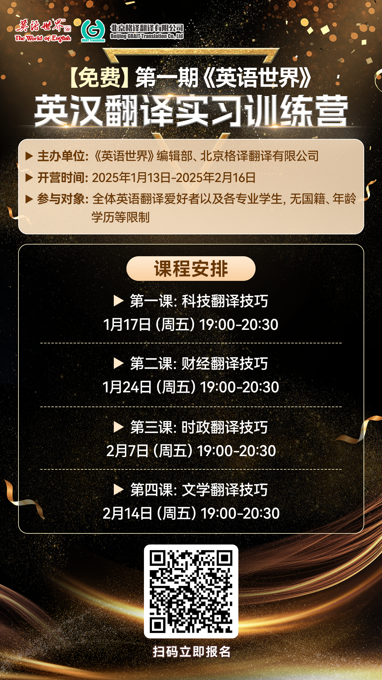 2、所有顺利完成实训营的学员均可获得《英语世界》编辑部和北京格译翻译有限公司签发的结业证书。