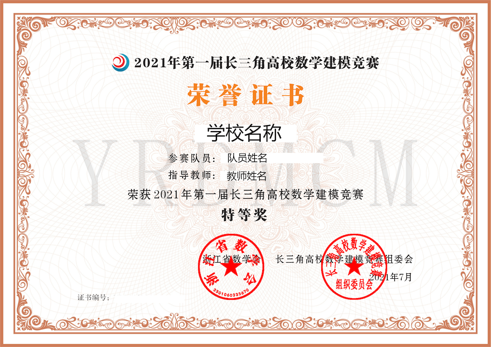 获奖者均将获颁盖有“浙江省数学会”印章的“长三角高校数学建模竞赛”获奖证书(注:提供电子证书,如有需要,也可申请纸质证书)。
