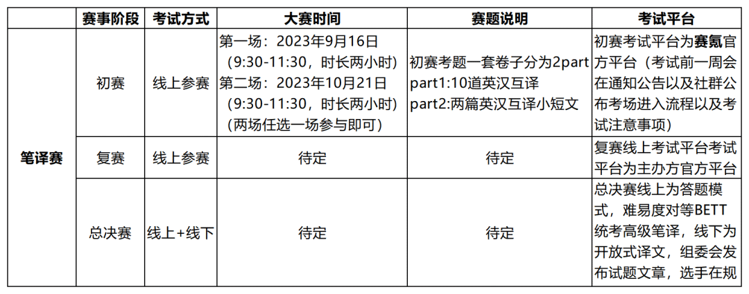 参赛人员可同时报考本组别的口译赛和笔译赛(本场为个人组笔译赛,口译赛报名链接://m.icdtc3.com/vse/BETT/interpret),请各位考生根据自己的实际情况时间选择一场进行考试,只可选择一场参赛,考场进入流程会在考前在群内以及通知公告处通知。
