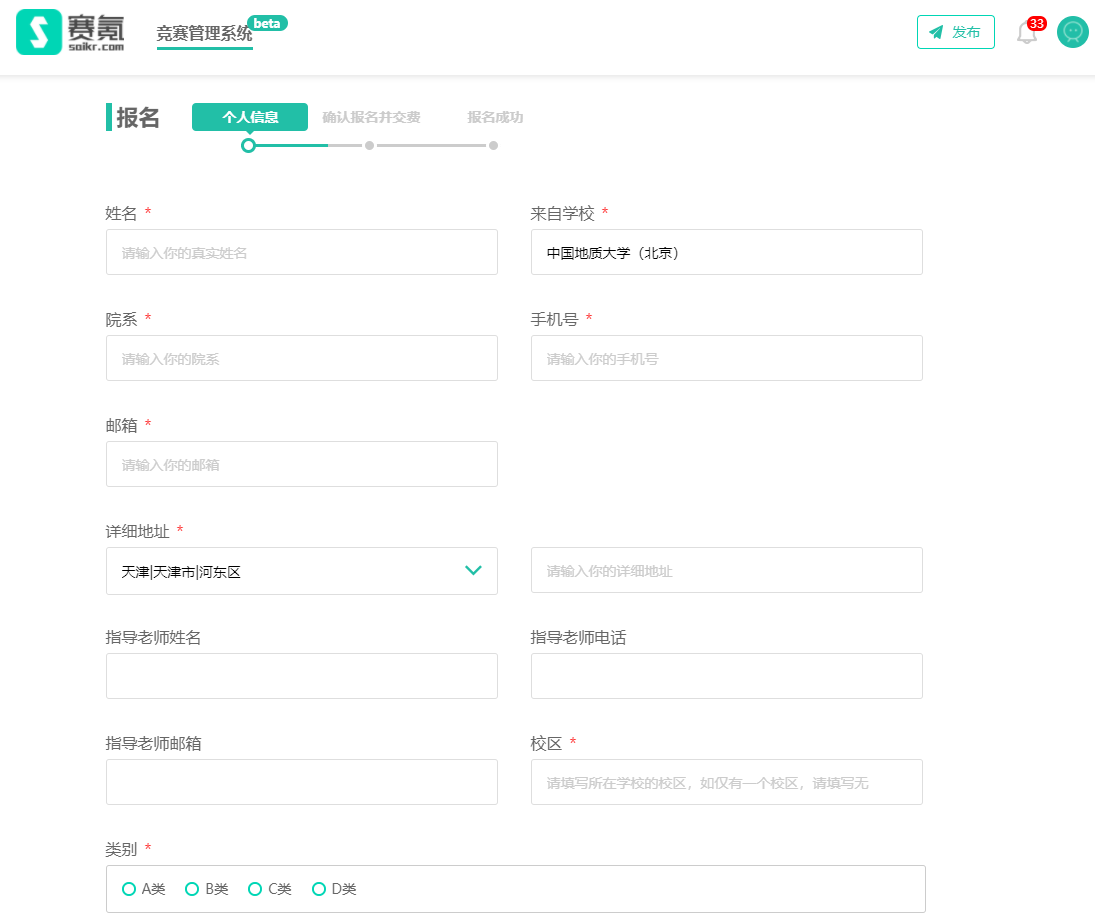 参赛者按照组委会要求填写,根据自己的专业仔细选择报考类别; 校区选择一项,关系到后续的证书邮寄,请根据自己实际所在的校区选择该项,如仅有一个校区请填写无;类别一项,根据自己的实际对应类选择,A类适用于研究生参加;B类适用于英语专业本、专科学生参加;C类适用于非英语专业本科生参加;D类适用于高职高专类学生参加。填写完后,点击“下一步”按钮,跳转到缴费页面。