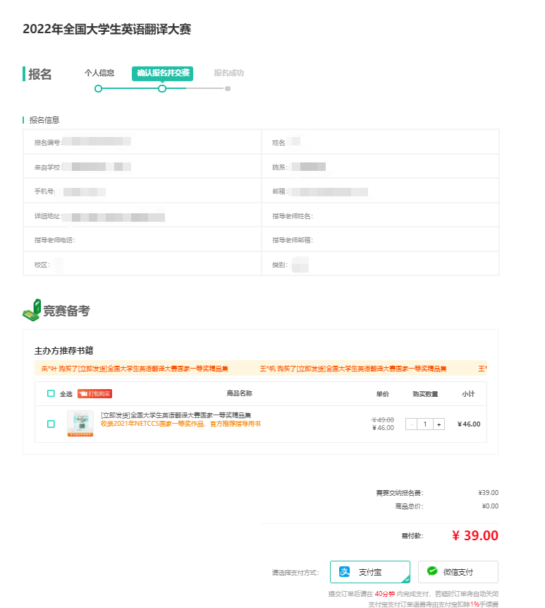 认真核对自己的信息,自行选购主办方推荐的竞赛书籍,点击“立即支付”按钮; 如需修改报名信息,点击“返回上一步”,即可进行修改。