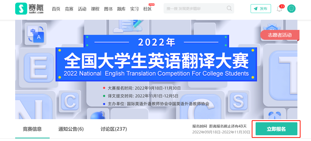 点击右上角“报名竞赛”,跳转页面后点击“立即报名”。