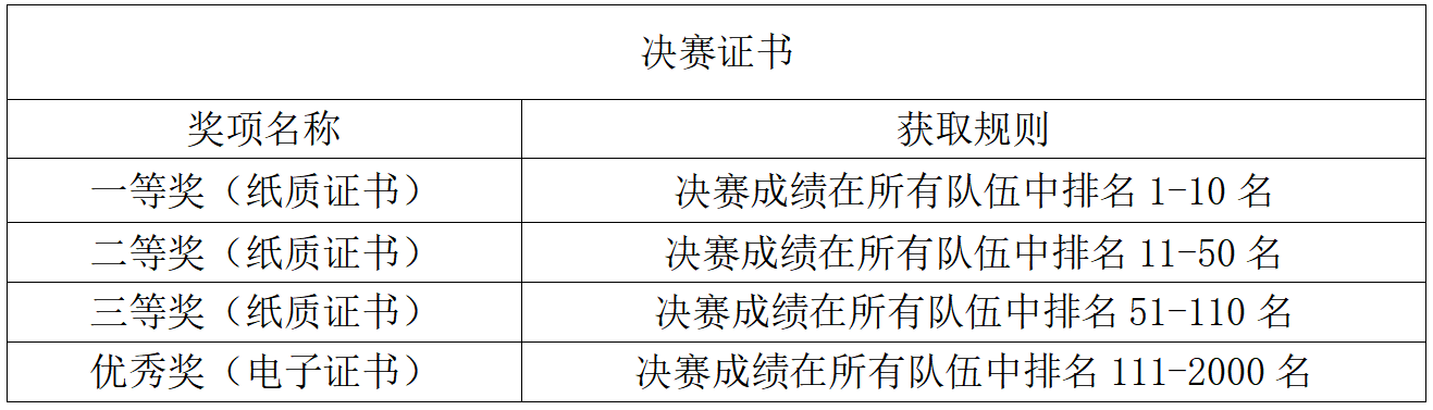(一)决赛证书(纸质、电子证书):每个团队最多 4 份(即 3 名同学与 1 名指导老师(若有)各一份)。具体发放规则如下表所示: