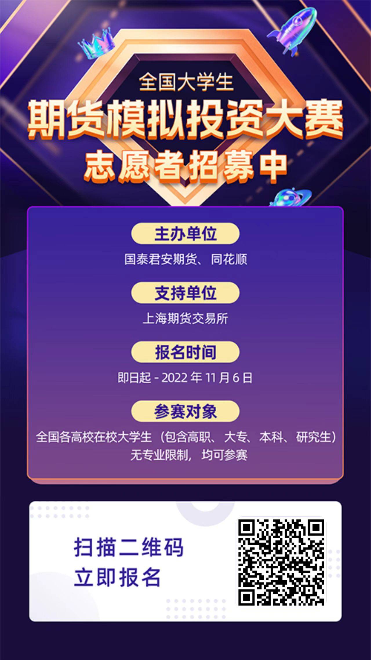 2022 投教进百校-全国大学生期货模拟投资大赛由国泰君安期货、同花顺主办,上海期货交易所提供支持。