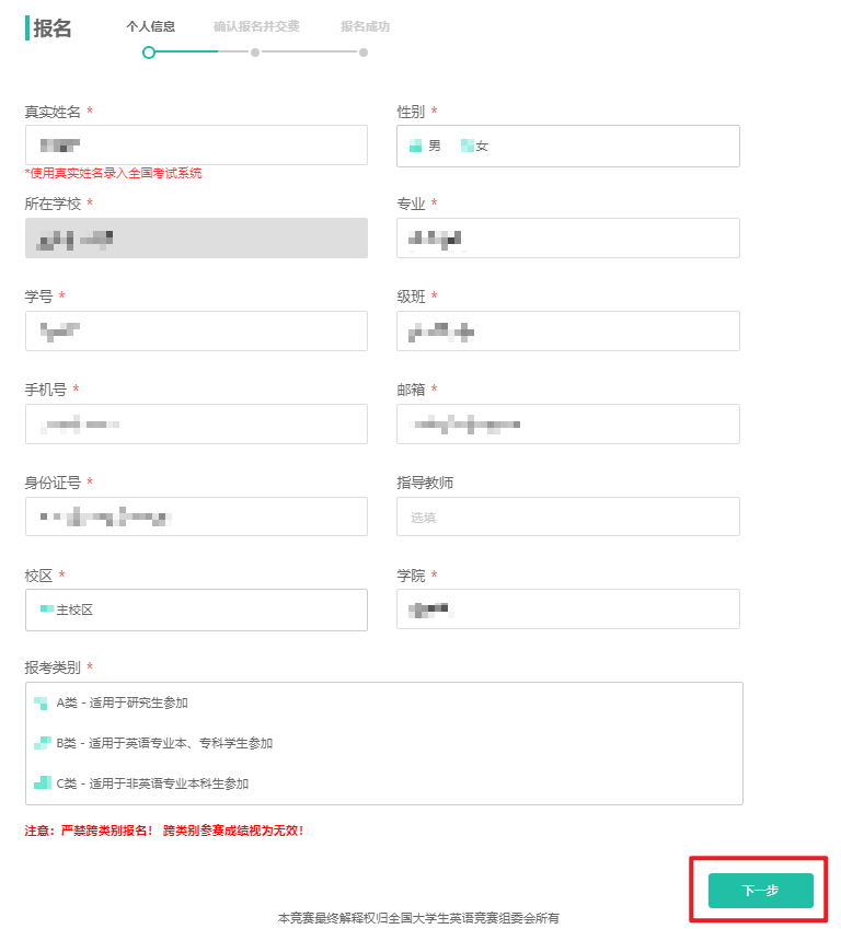 填写真实的报名信息后,选择下一步。带有*标的为必填项,无*标为选填。竞赛严禁跨类别报名!跨类别参赛成绩视为无效!如无所在类别说明学校未开通该类别的报名,可咨询您所在赛区或学校相关负责人。