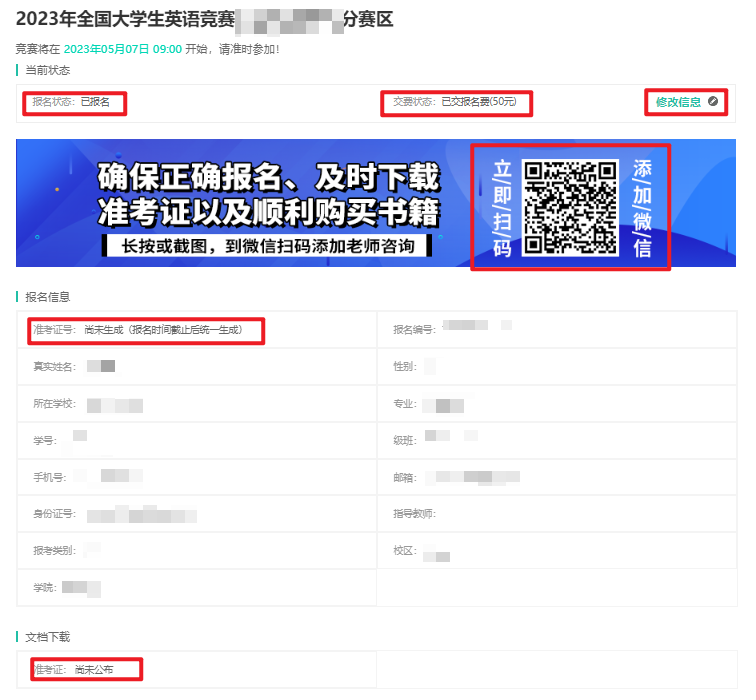 ② 报名截止前可点击修改信息修改报名信息;