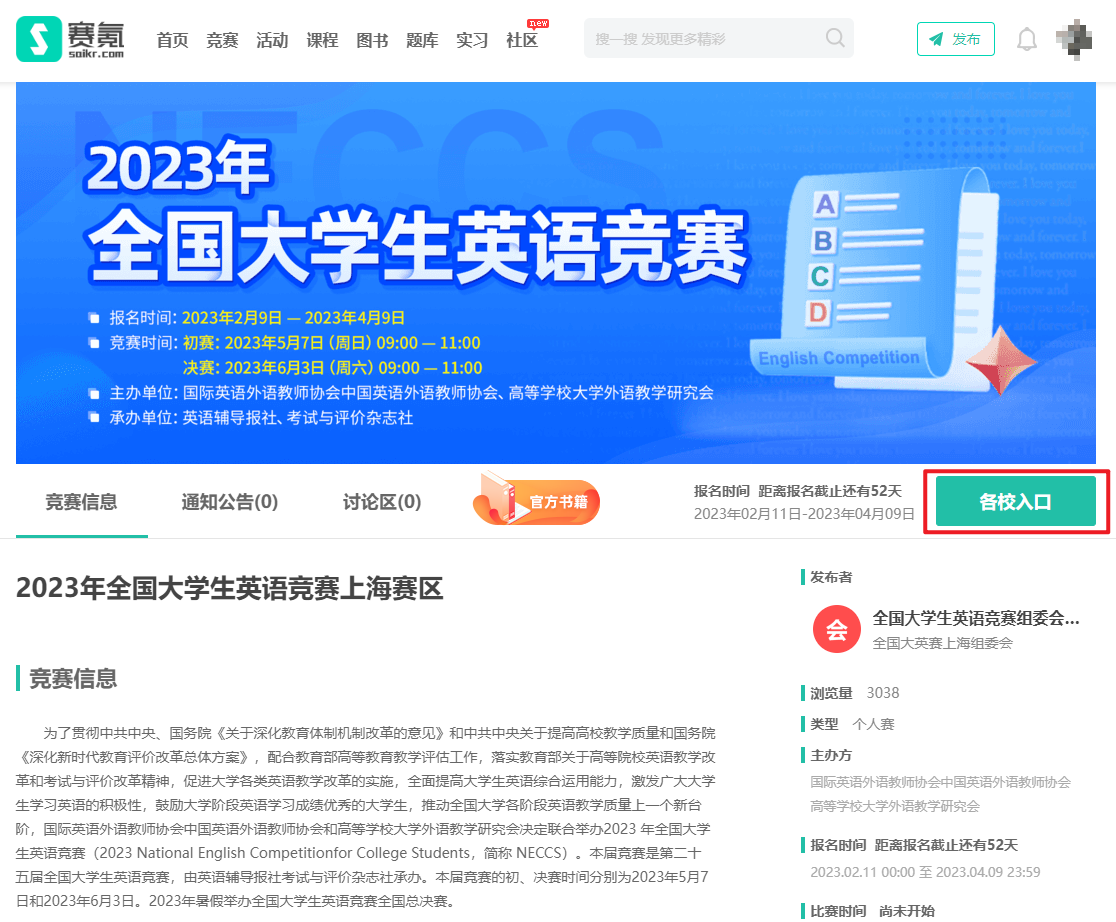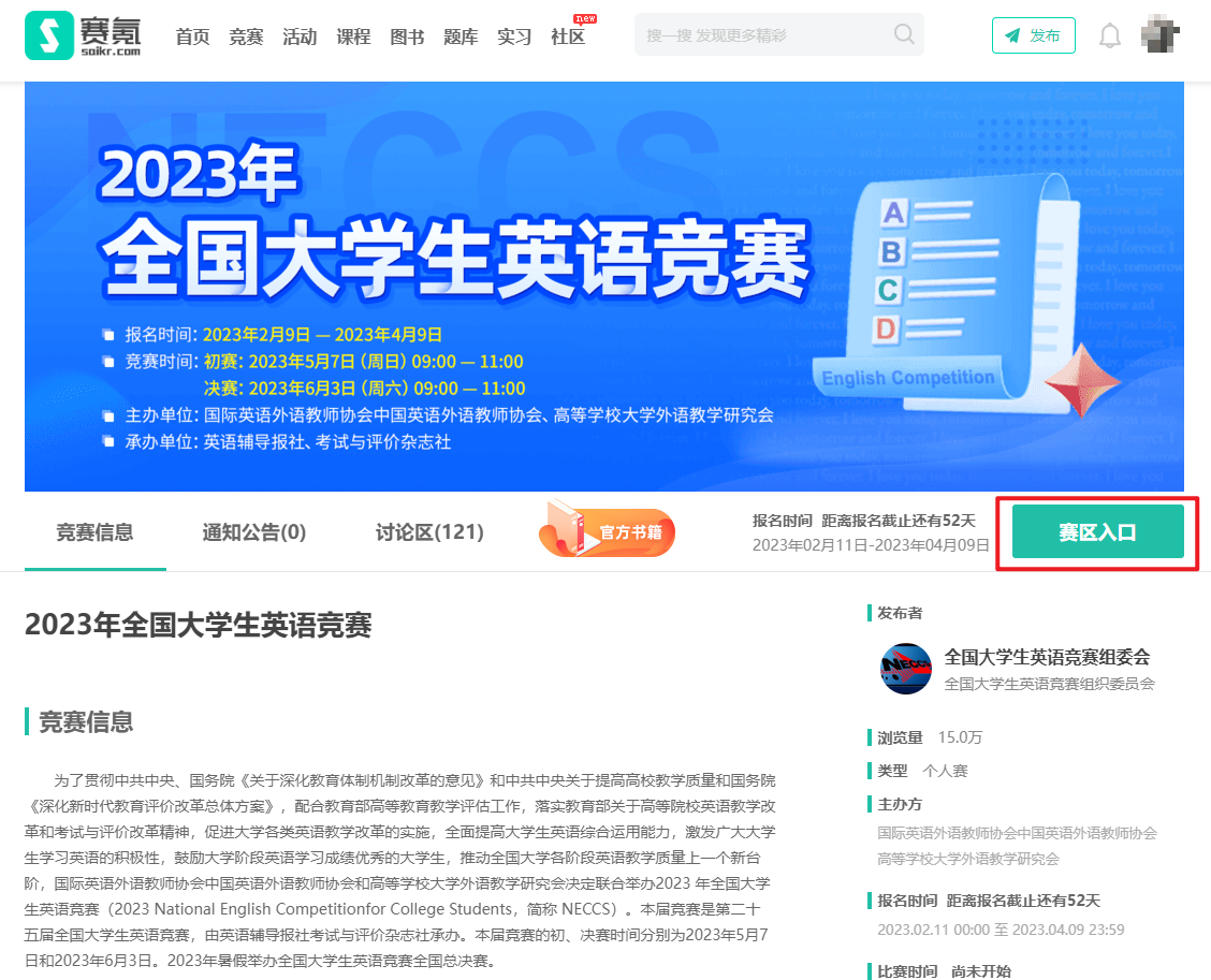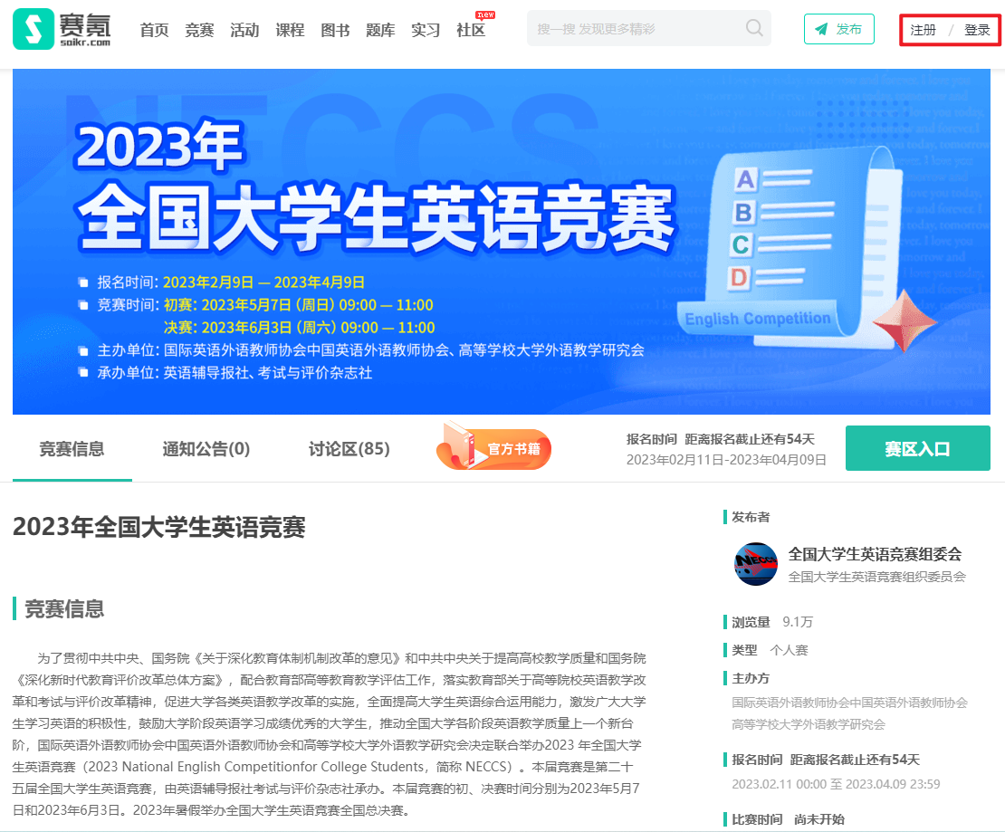 打开赛氪大英赛报名官网(m.icdtc3.com/neccs/2023),或扫描下方二维码进入,点击右上角注册/登录。