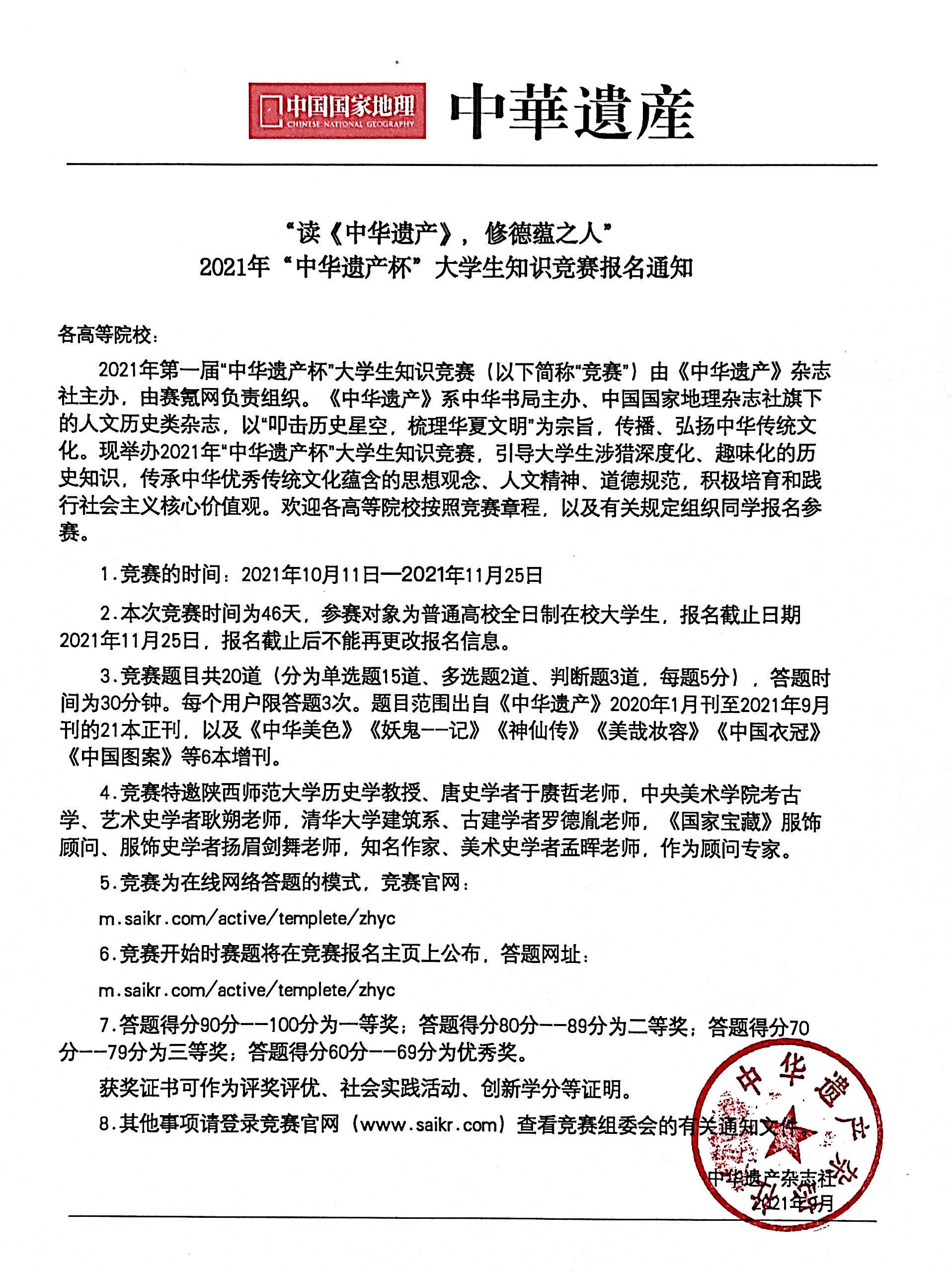 为认真贯彻落实中共中央办公厅、国务院办公厅印发《关于实施中华优秀传统文化传承发展工程的意见》,进一步强化大学生历史责任感,《中华遗产》系中华书局主办、中国国家地理杂志社旗下的人文历史类杂志,以“叩击历史星空,梳理华夏文明”为宗旨,传播、弘扬中华传统文化。现举办2021年“中华遗产杯”大学生知识竞赛,引导大学生涉猎深度化、趣味化的历史知识,传承中华优秀传统文化蕴含的思想观念、人文精神、道德规范,积极培育和践行社会主义核心价值观。