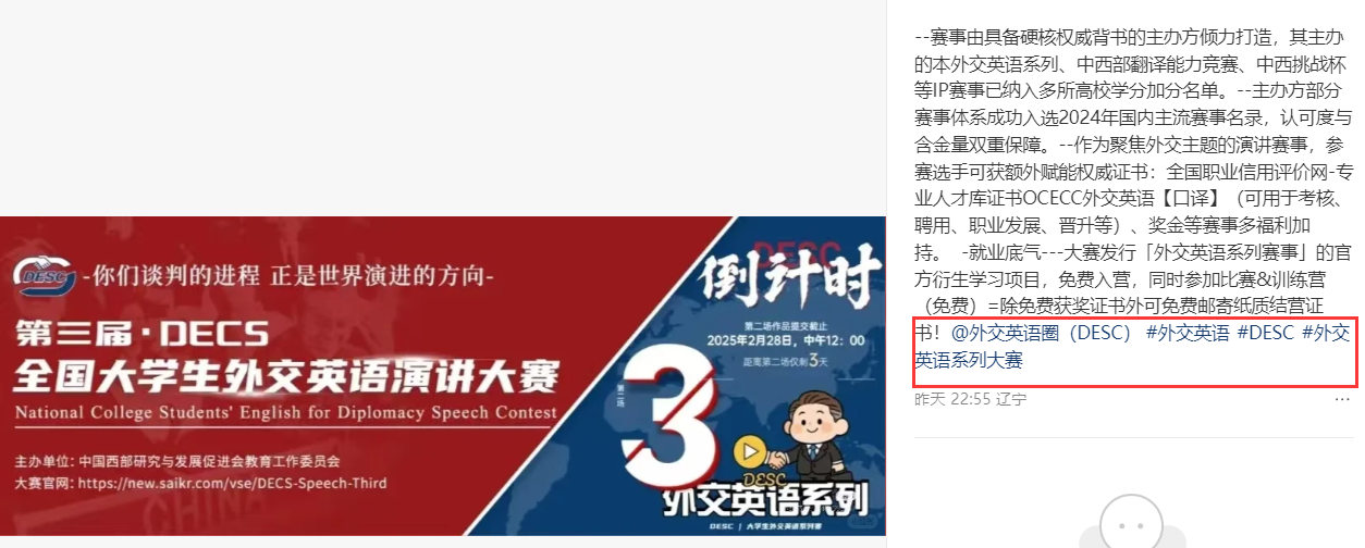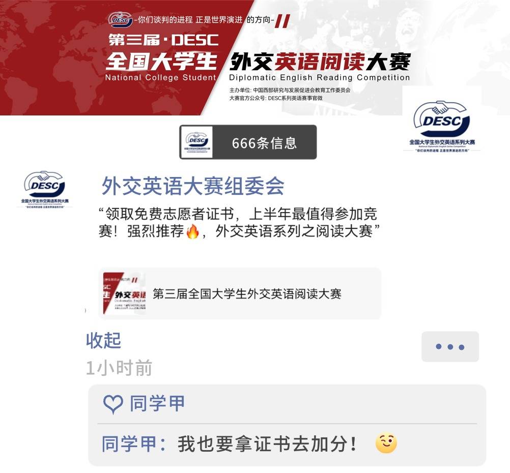 转发宣传官方大赛页面至微信朋友圈/QQ社群/小红书等,截图满1小时无分组,可配文案:“领取免费志愿者证书,上半年最值得参加竞赛!强烈推荐,外交英语系列之阅读大赛”