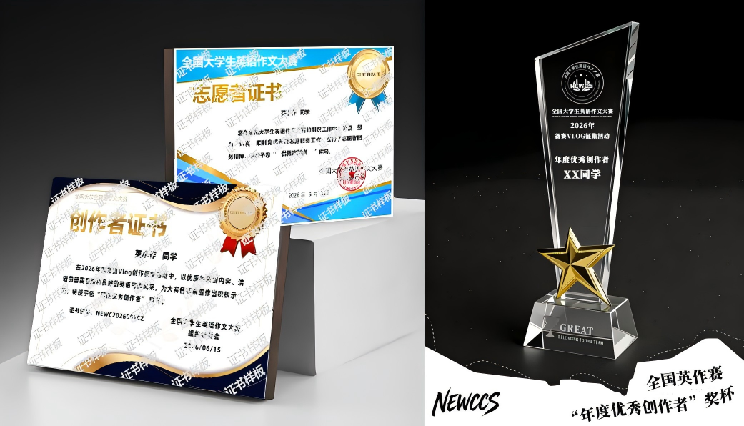用镜头记录备赛点滴,分享英语写作备考心得,多维度展现赛事魅力!优秀作品将在大赛官方平台展播,创作者可斩获定制荣誉“年度优秀创作者”证书+奖杯,还能积累综测加分凭证,快来参与!
