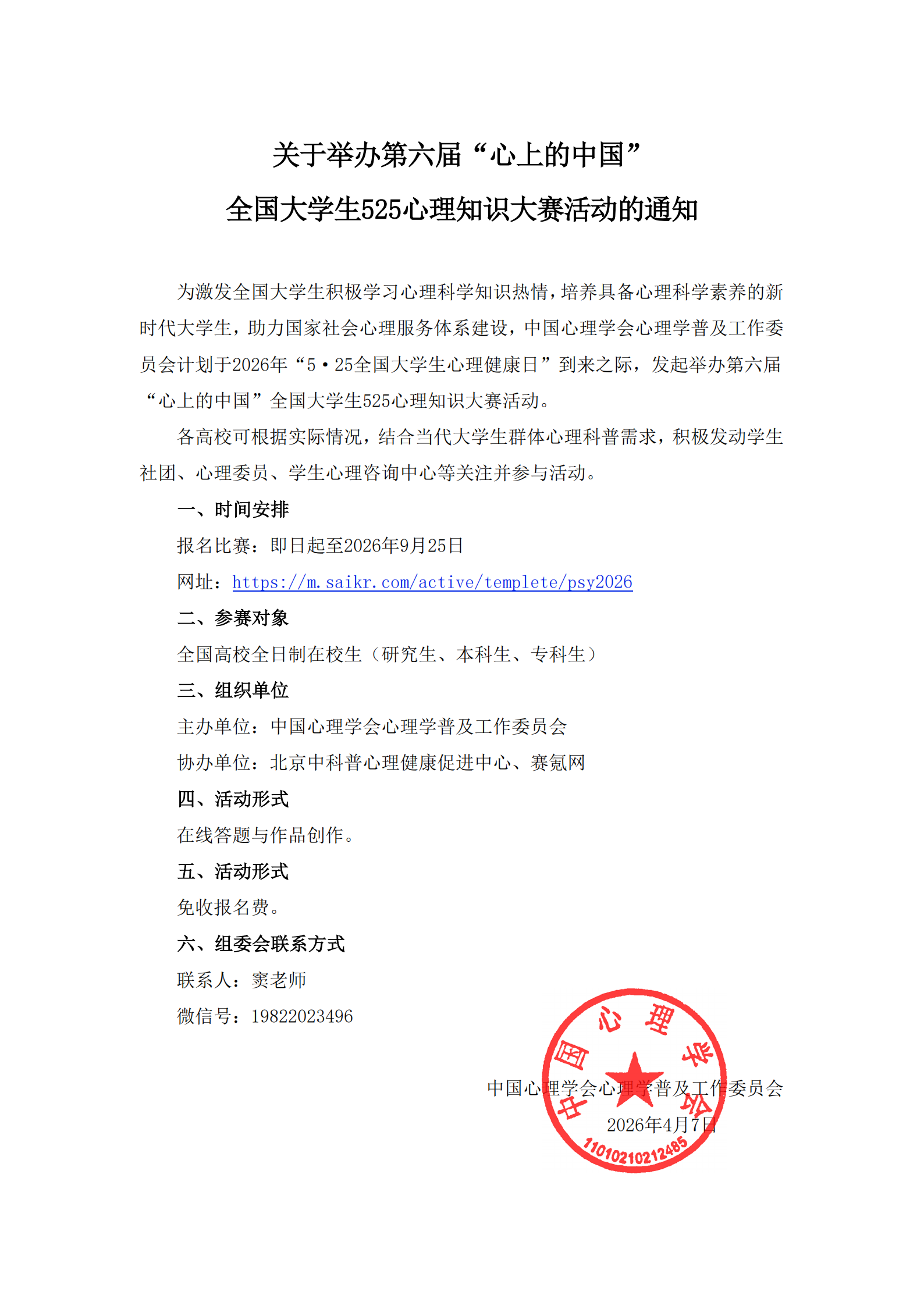 【发文】关于举办第六届“心上的中国”全国大学生525心理知识大赛活动的通知