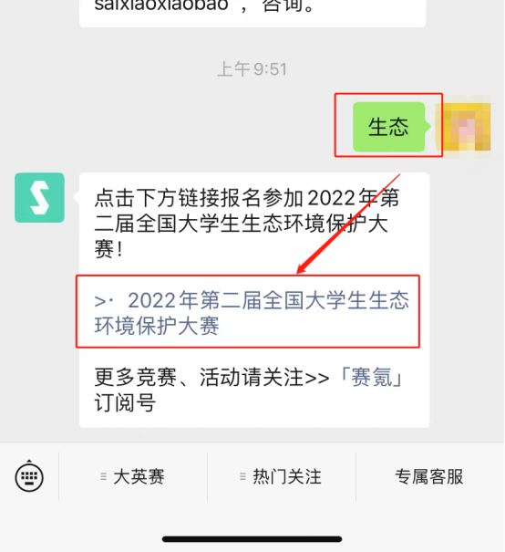 3、关注微信公众号“赛氪校园”,后台回复“生态”,点击蓝字即可报名,如图所示