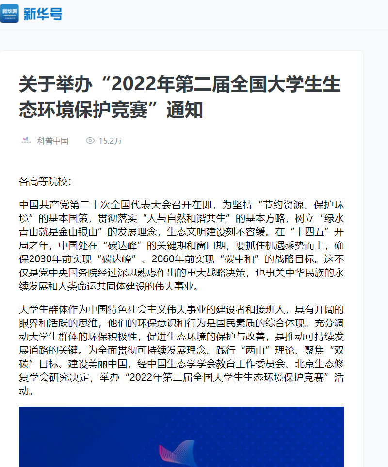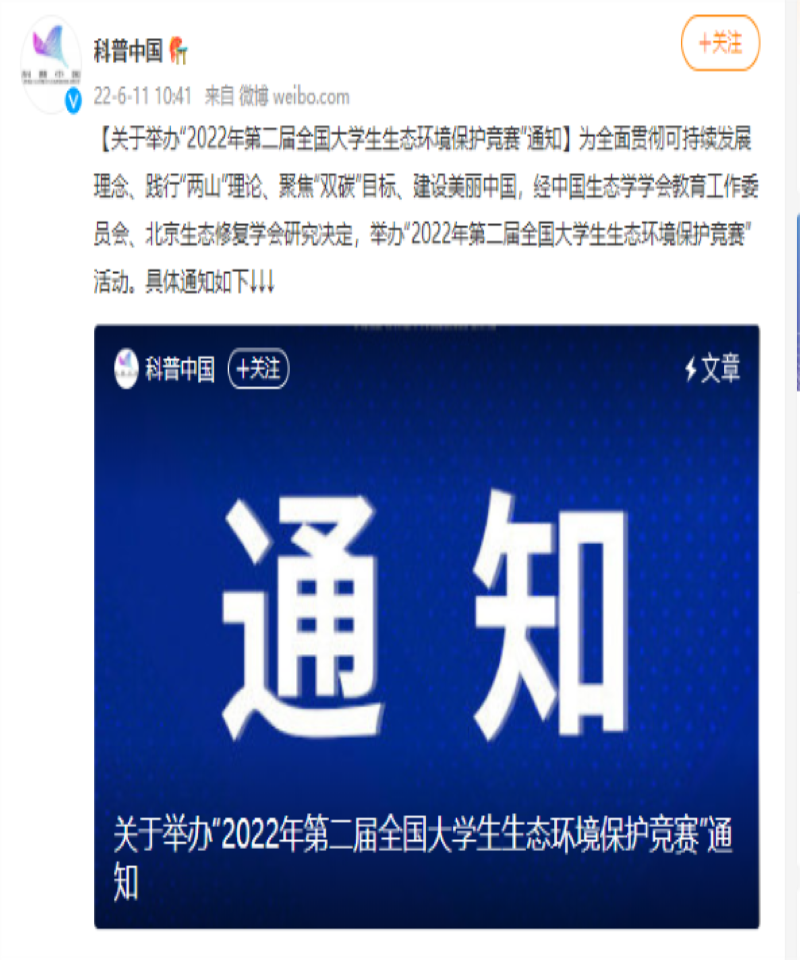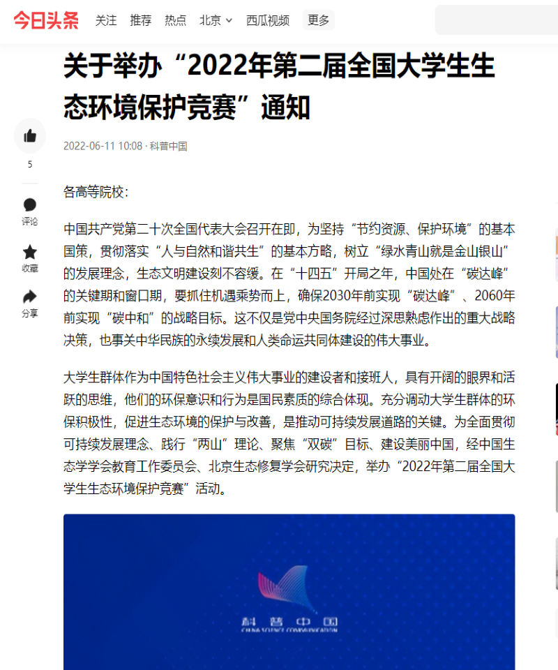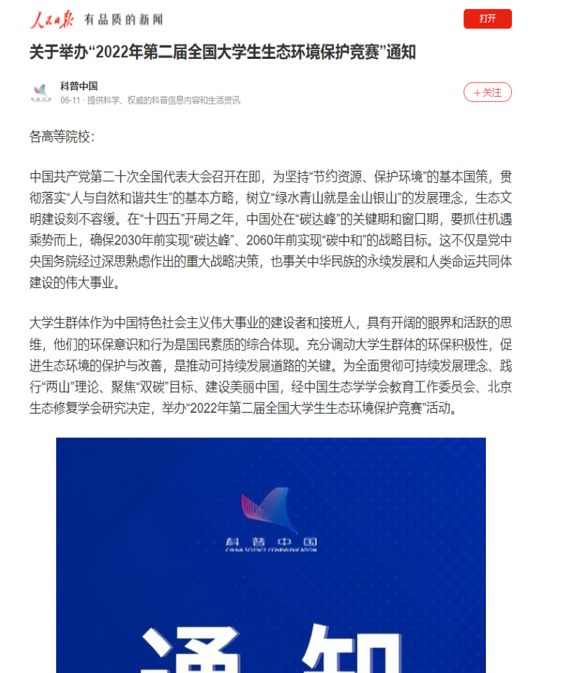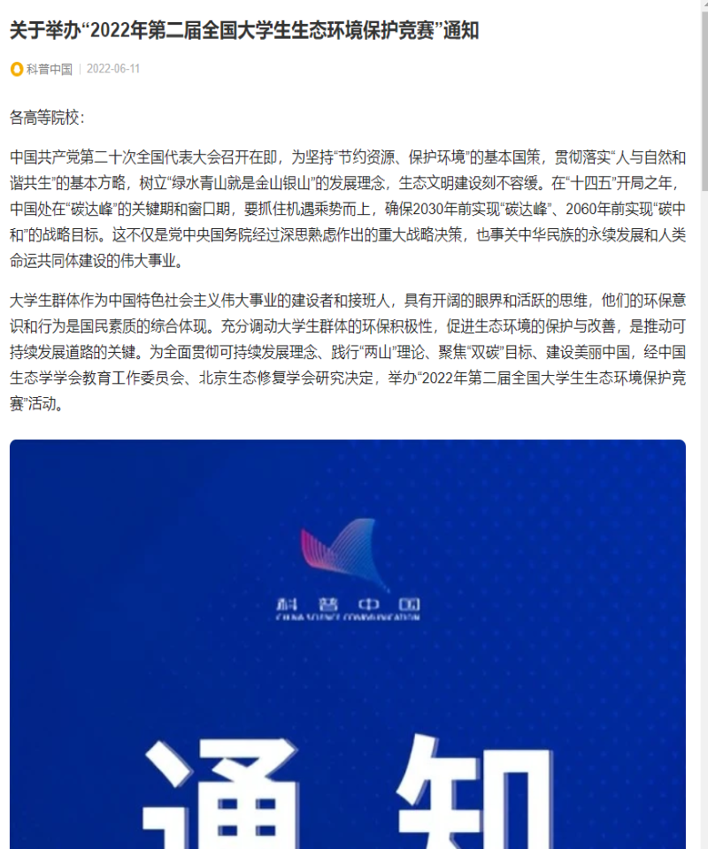科普中国(中国科协塑造的品牌)强烈推荐大赛:“2022年第二届全国大学生生态环境保护竞赛”