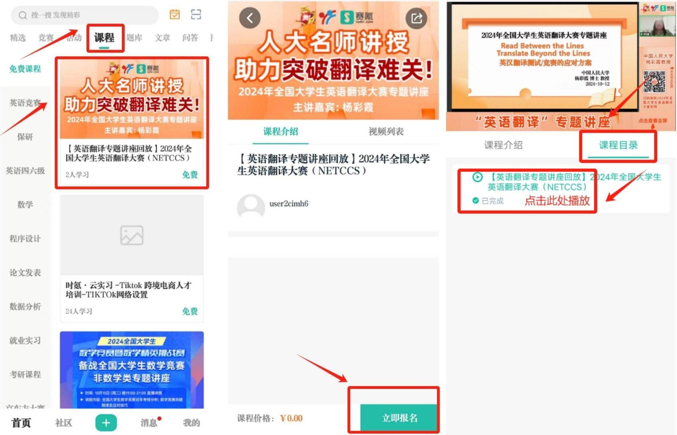 进入赛氪app—点击课程—点击本次讲座回放—点击立即报名—点击播放