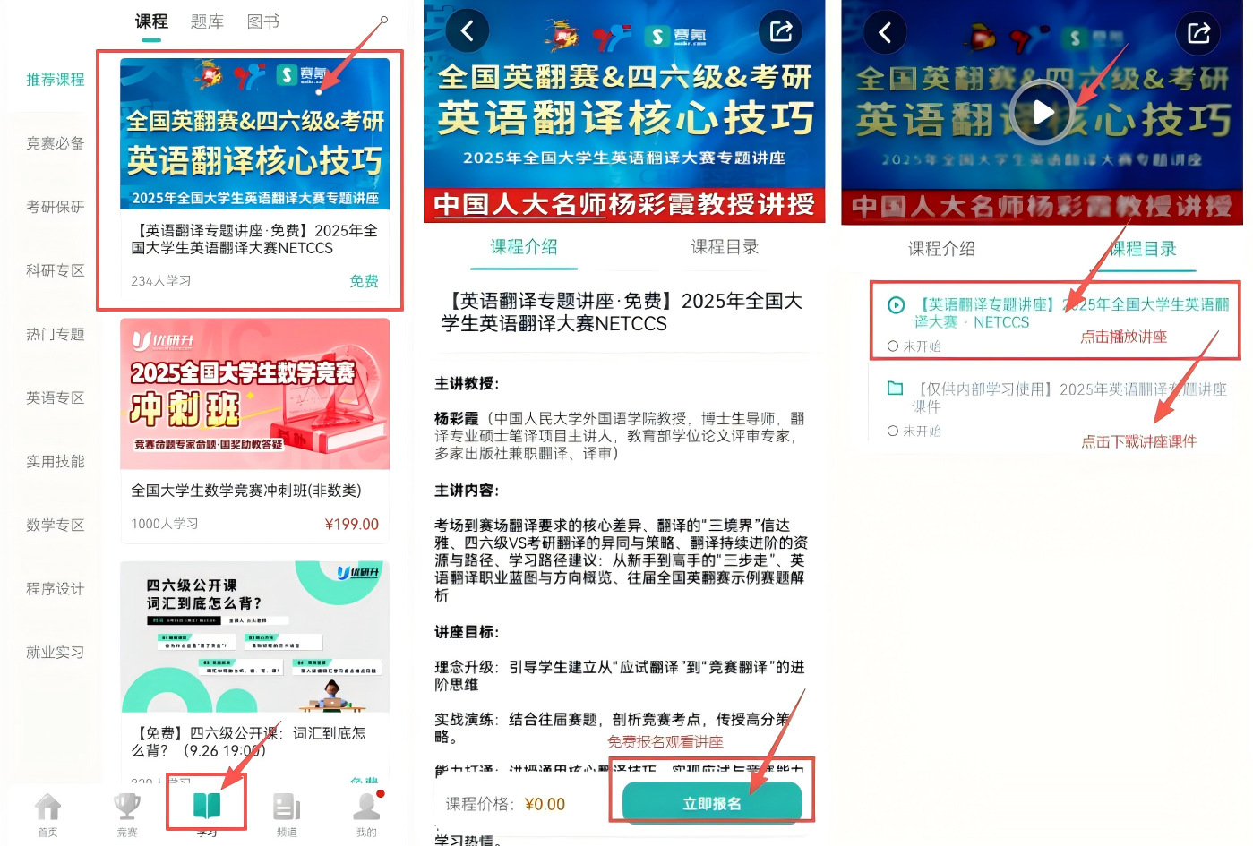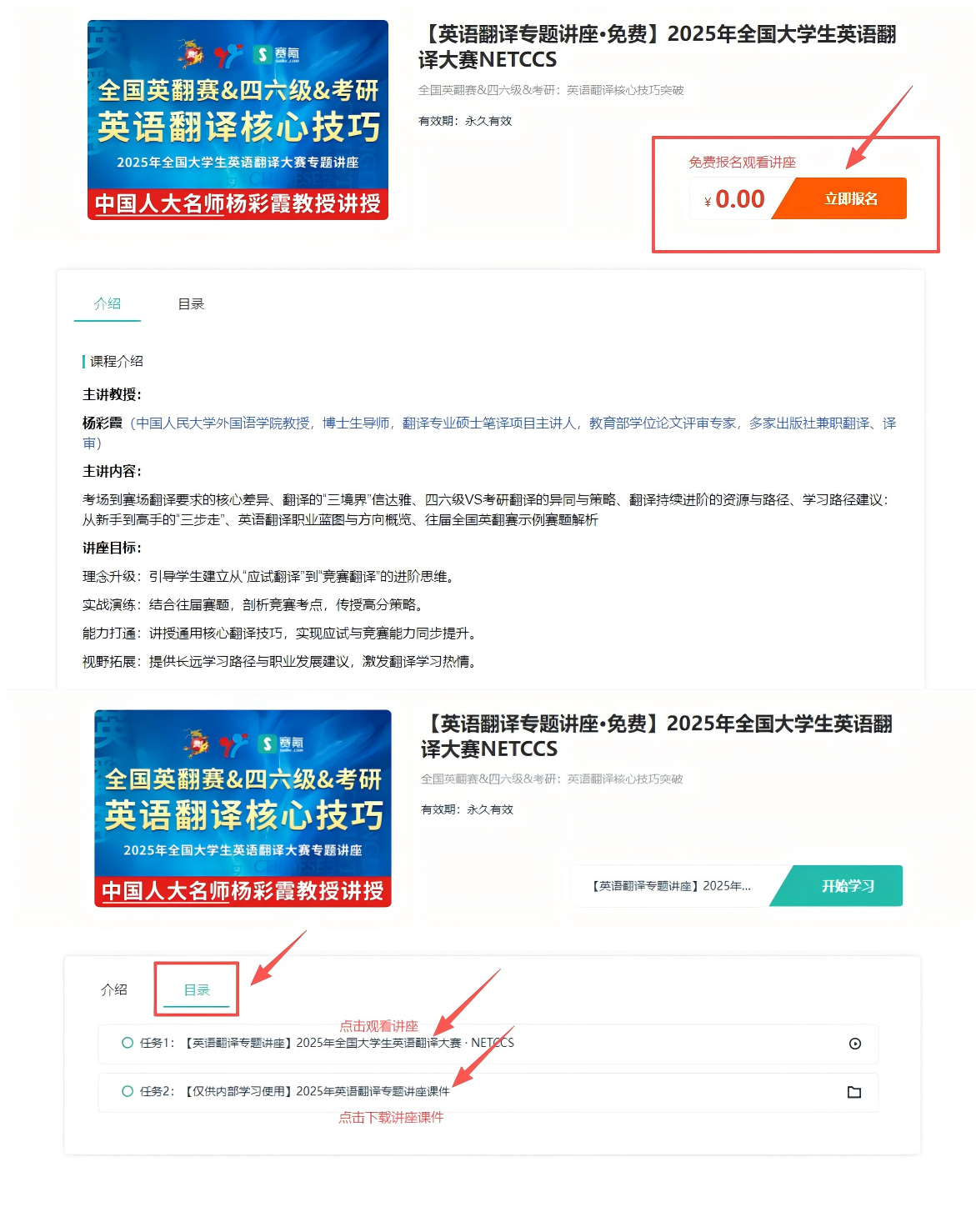 2、点击“立即报名”—点击“开始学习”观看学习讲座