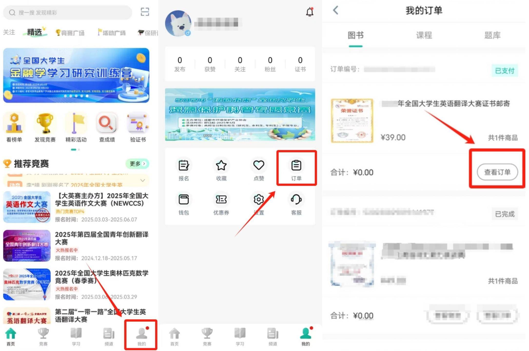 2、登录赛氪(使用参赛账号登录)APP—我的—订单—查看订单。