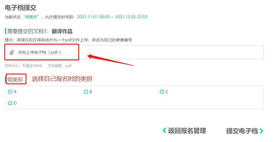 3.上传已经将英译汉和汉译英合并过的pdf版本文件,下方选择自己报名时的组类别。
