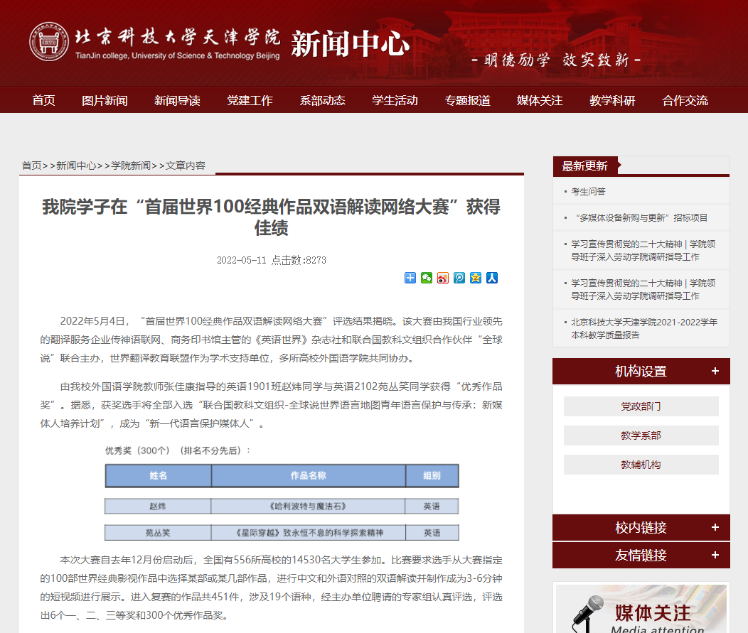 北京科技大学官网报道展示