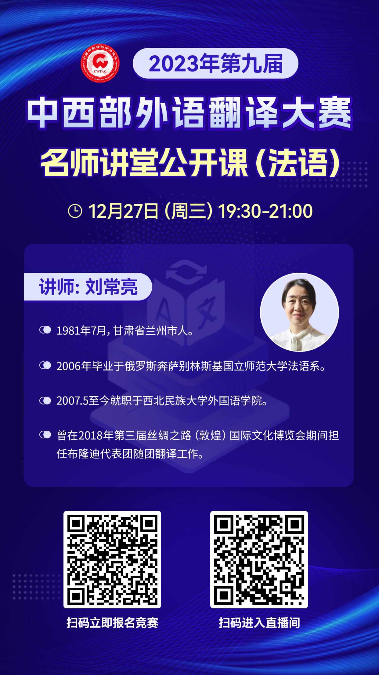 中西部外语翻译大赛开展的名师讲堂公开课前四场已成功举办。第五场日语组直播在今天(12月26日)19:30—21:00、第六场法语组直播在明天(12月27日)19:30—21:00。公开课直播可以帮助学生熟悉考试题型,直播过程中还有机会与老师实时互动,共同探讨学习心得。可扫码或点击链接进入直播间观看学习!(扫码或点链接可观看其他语种直播回放!)