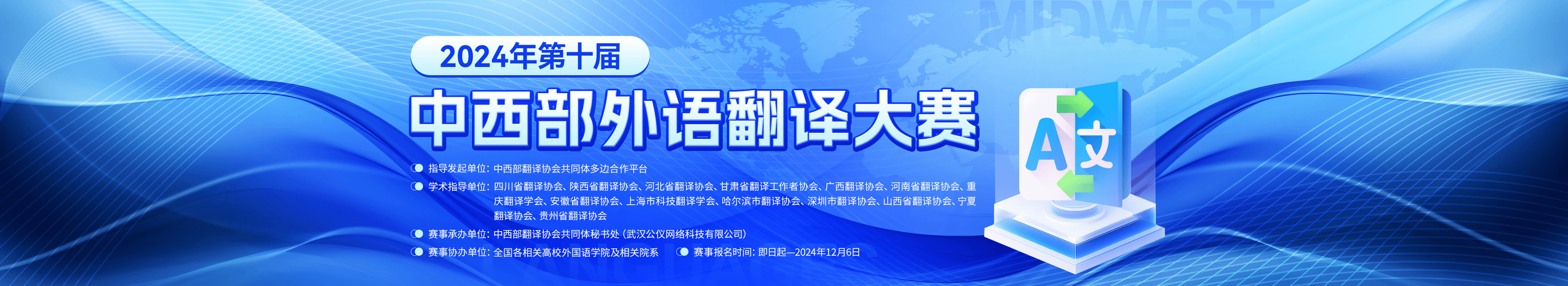 第十届赛事继续由中西部翻译协会共同体多边合作平台发起主办,各省市译协联合组织学术指导,2024年第十届中西部外语翻译大赛由中西部翻译协会共同体秘书处(武汉公仪网络科技有限公司)、赛氪网承办。