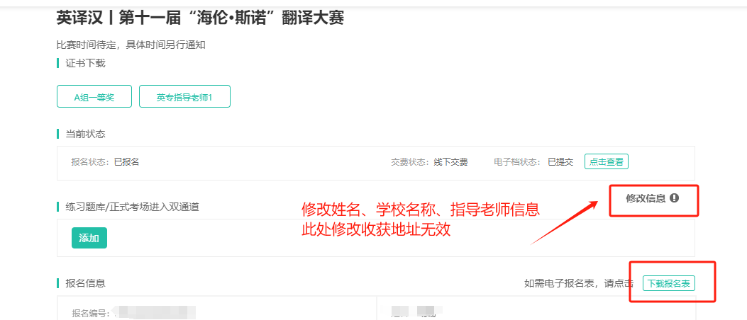 ●若证书信息有误需要修改,自行在赛氪—报名管理——报名信息处修改即可。