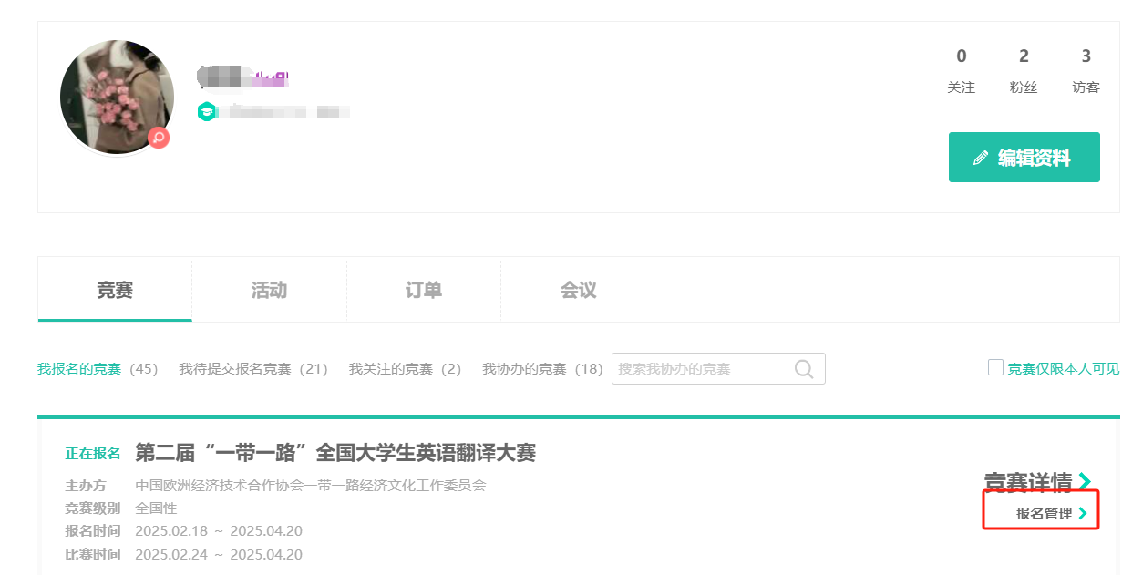 2、找到本赛事,点击“报名管理”。