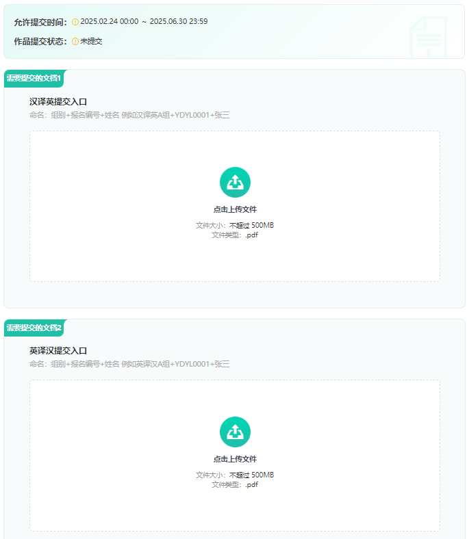 3.作品提交时注意命名为“组别(英译汉/汉译英 A组/B组)+报名编号+姓名”,在提交页面选择与报名一致的参赛组别,以免造成专家评阅错误作品。