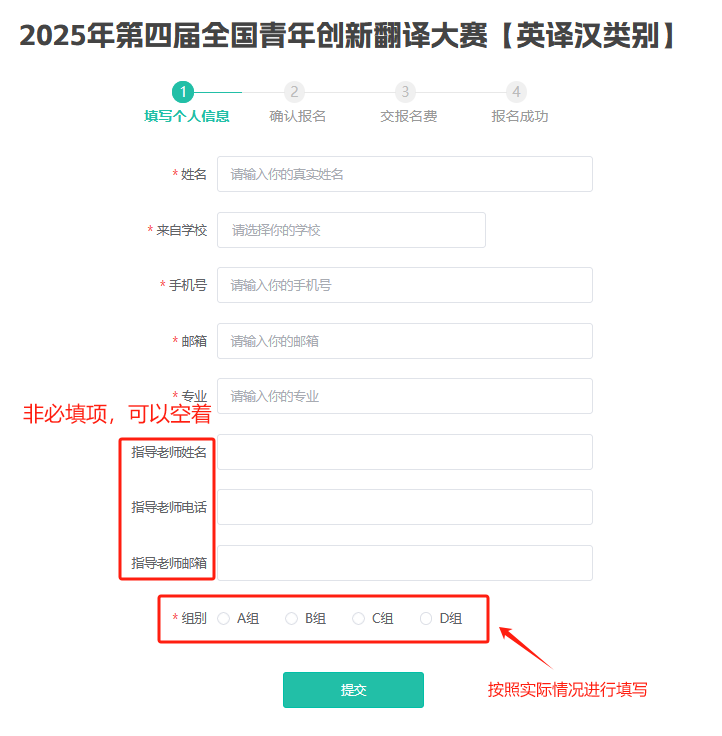3.将个人信息准确填写好后,点击下一步。(tips:A组:研究生及同等学历;B组:外国语言文学类本科及同等学历;C组:非外国语言文学类本科及同等学历;D组:专科及同等学历 )