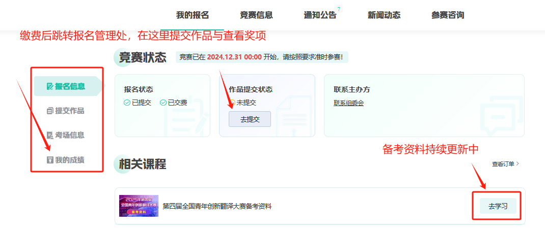 5.缴费报名成功后,会自动跳转至报名管理,在此可看到作品提交处。