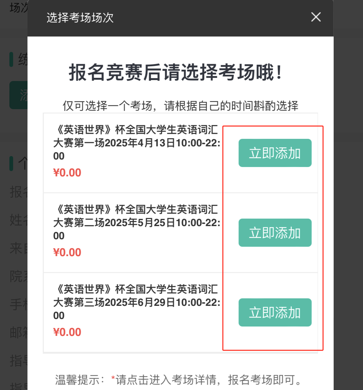 报名成功后,可至“报名管理”处选择考场。共三个场次,任选一场参加。参赛选手在比赛开放期间任选60分钟完成比赛即可,每人每组别仅一次答题机会。