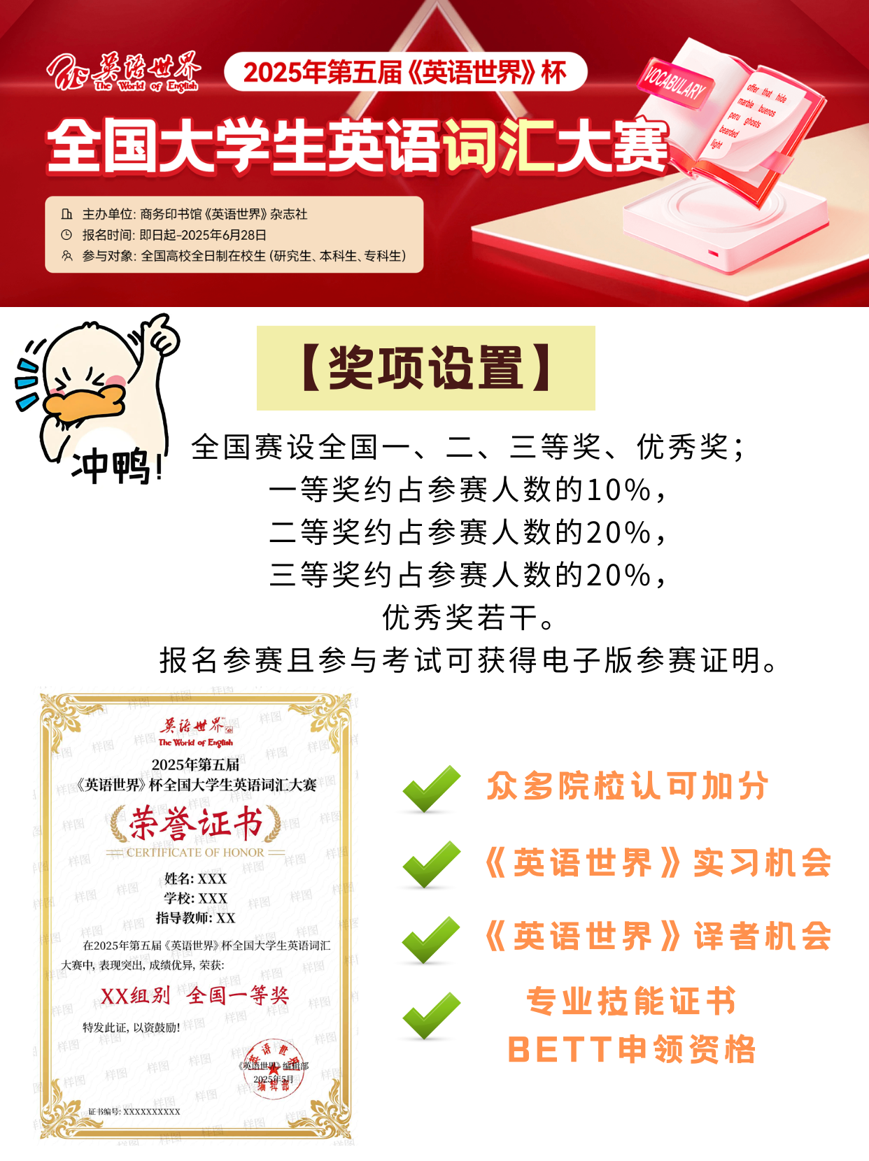 为了更好的普及、宣传本次大赛,激发同学们对英语翻译的兴趣,特面向全国高校招募2025年第五届《英语世界》杯全国大学生英语词汇大赛志愿者。