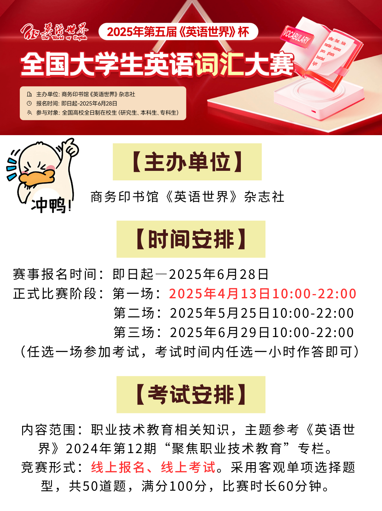3、宣传字数不少于20字,文案不可重复,配图可使用以下图片,也可自己制作。结尾加上话题 #《英语世界》杯全国大学生英语词汇大赛 #英语竞赛 #大学生等。
