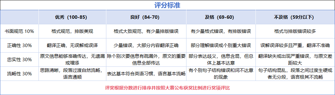 译文要求忠实原文、用词准确、表达完整、流畅。成绩一经评出即向参赛的学校和学生公布。