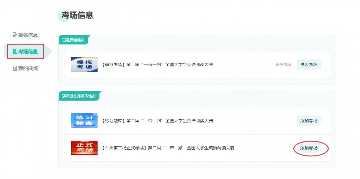 step2:看清楚考场标题前缀!红色框为【7月26日第二场正式考场】,各位参赛选手必选!