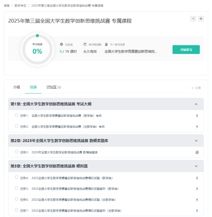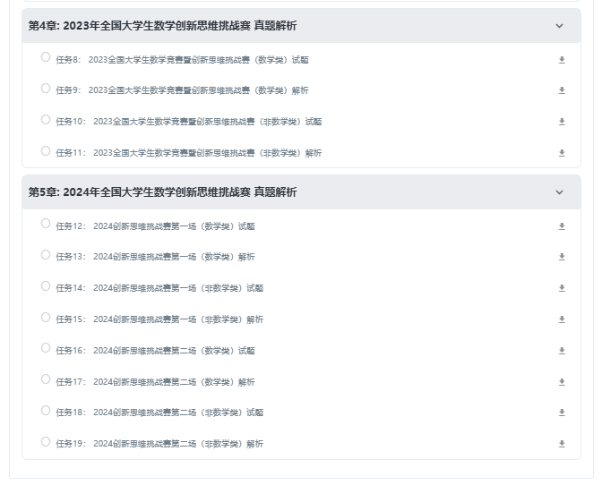 为保证参赛者了解竞赛内容、形式,并于竞赛中获得成长。2025第三届全国大学生数学创新思维挑战赛将往届赛题解析以及练习题库等资料公布在下方课程中,各位同学可自行下载作为练习提升使用。