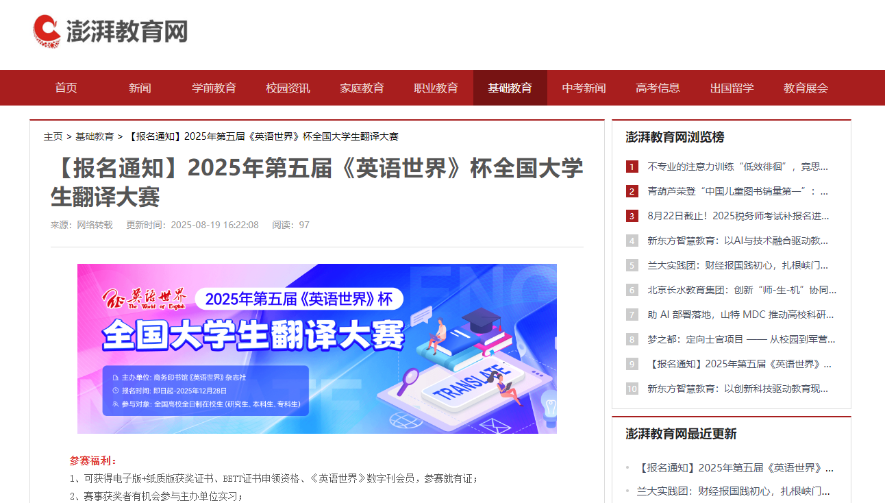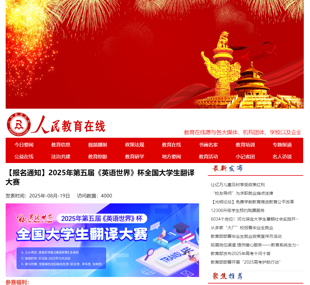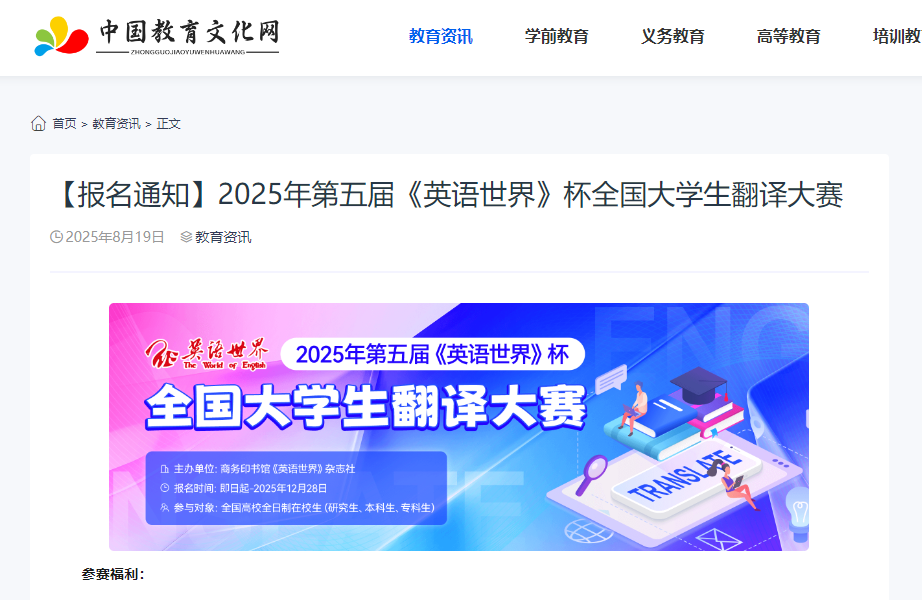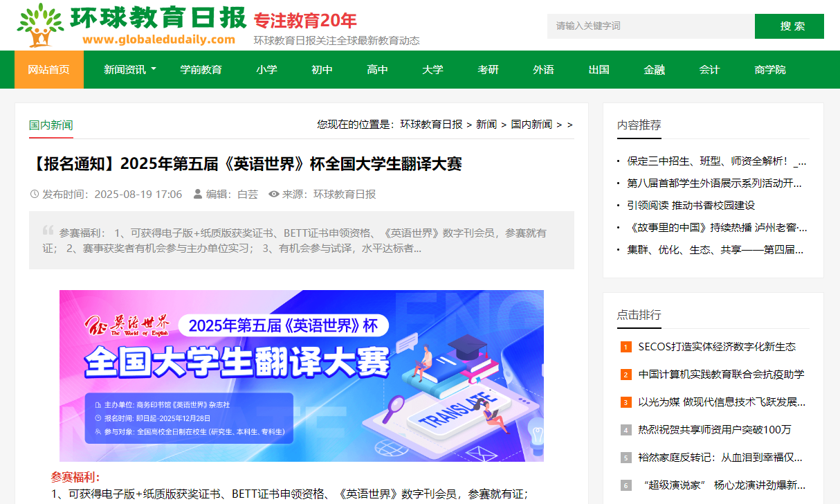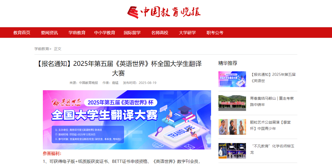 由商务印书馆《英语世界》杂志社主办的“2025年第五届《英语世界》杯全国大学生翻译大赛”,得到了全国各高校老师、同学的广泛支持和关注,大赛组委会再次对各高校的支持表示感谢!