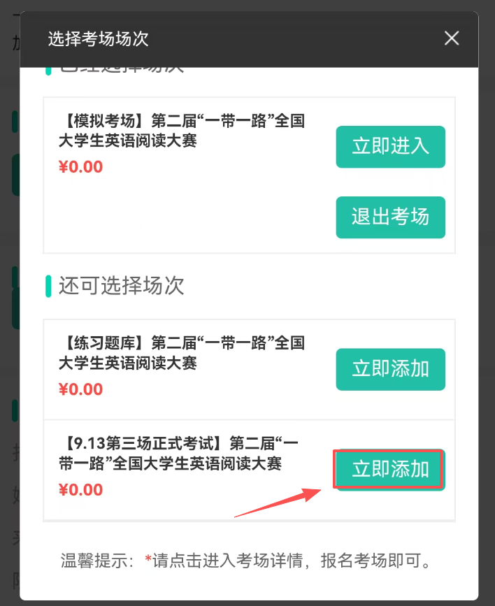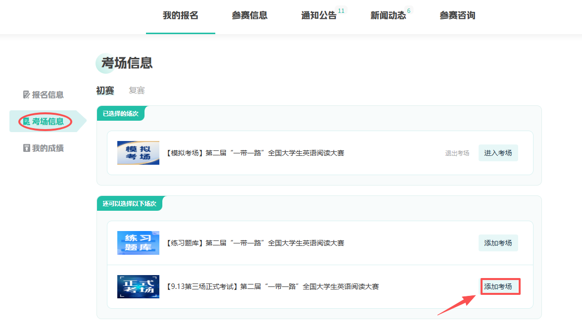 step2:看清楚考场标题前缀!红色框为【9月13日第三场正式考场】,各位参赛选手必选!